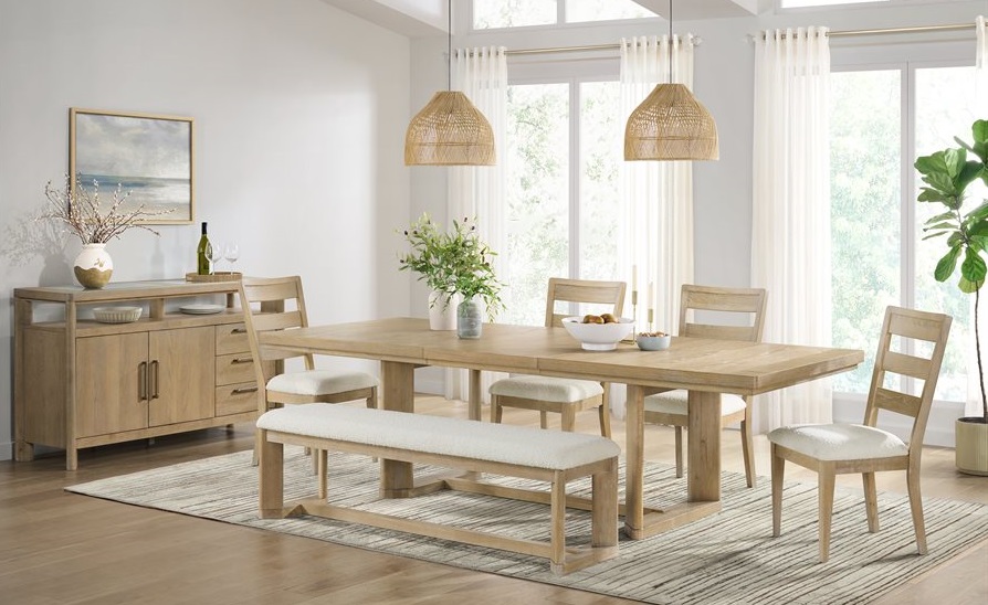 Burnished and aged hardware accent the sand dune colored finish featuring light wire brushing, glazing, rasping, and sand-through. This collection has both an extension leg table and formal trestle table. You'll find a perfect blend of modern, rustic, and coastal design aesthetics with the rounded shapes, neutral tones, and textural cream boucle fabric on the upholstered seats.