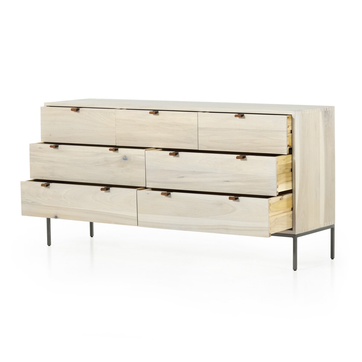 The Trey 7 Drawer Dresser, inspired by clean mid-century design, features a light-washed poplar construction with seven spacious drawers for ample storage. Metal-secured leather pulls add a unique textural touch, enhancing its stylish appeal.