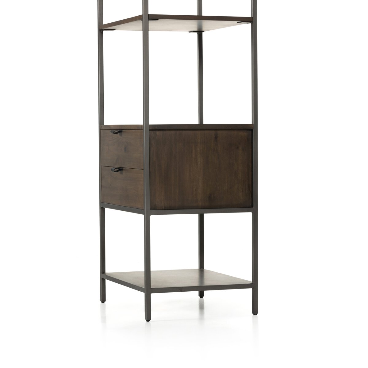 The Trey Bookshelf blends mid-century design with a modern twist, combining greyish auburn poplar and raw iron for a stylish, functional piece. Open shelving, dual drawers, and metal-secured leather pulls offer ample storage and a unique textural touch, perfect on its own or paired with a matching media console.