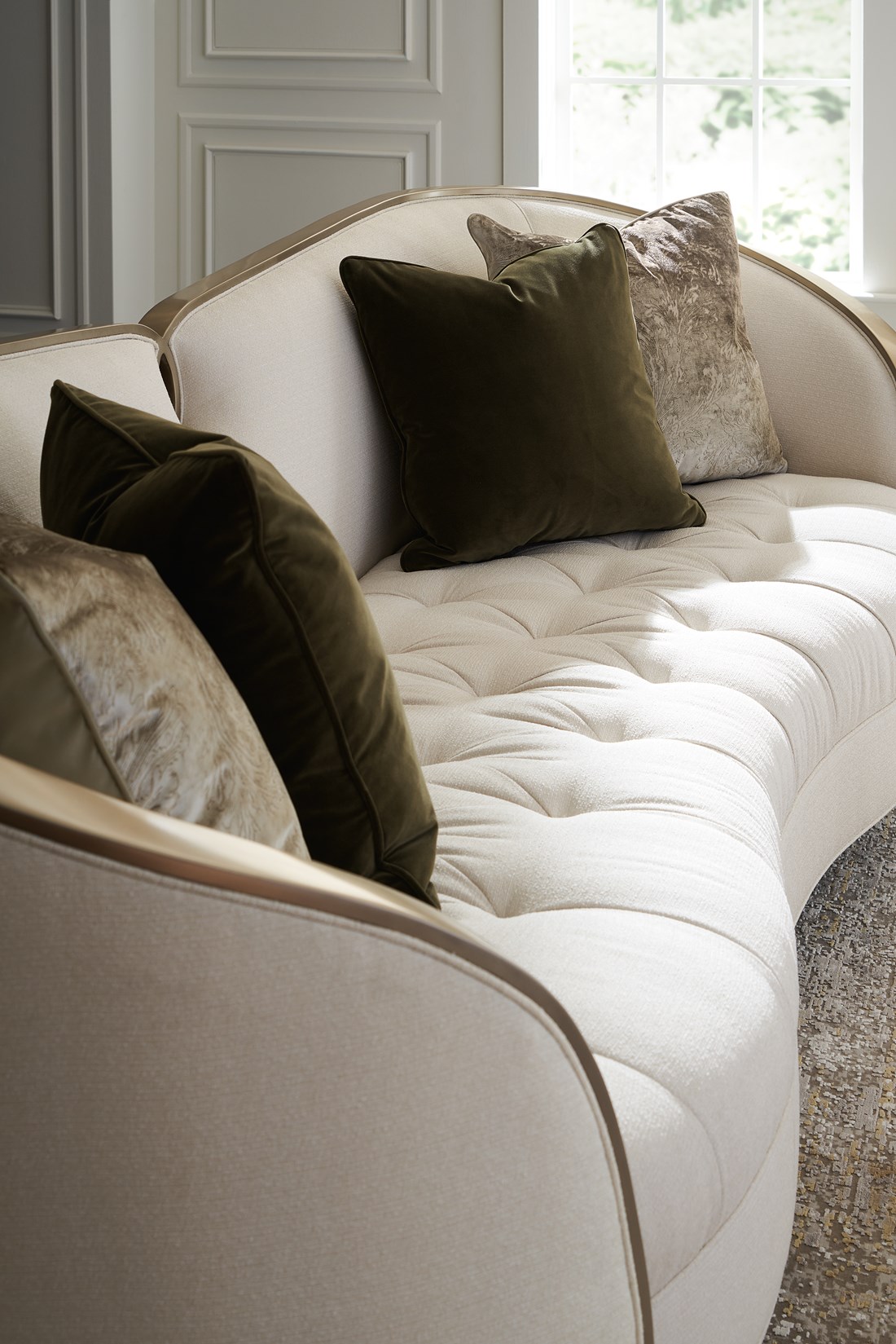 The Valentina sofa features a Golden Shimmer finish that highlights its enveloping silhouette, complemented by an exposed wood frame and sleek, tapered legs. Exquisite tailoring includes a tight back and button-tufted seat in micro-denier chenille with a textured ottoman weave. Luxurious satin and velvet accent pillows add a touch of romance and trending color.