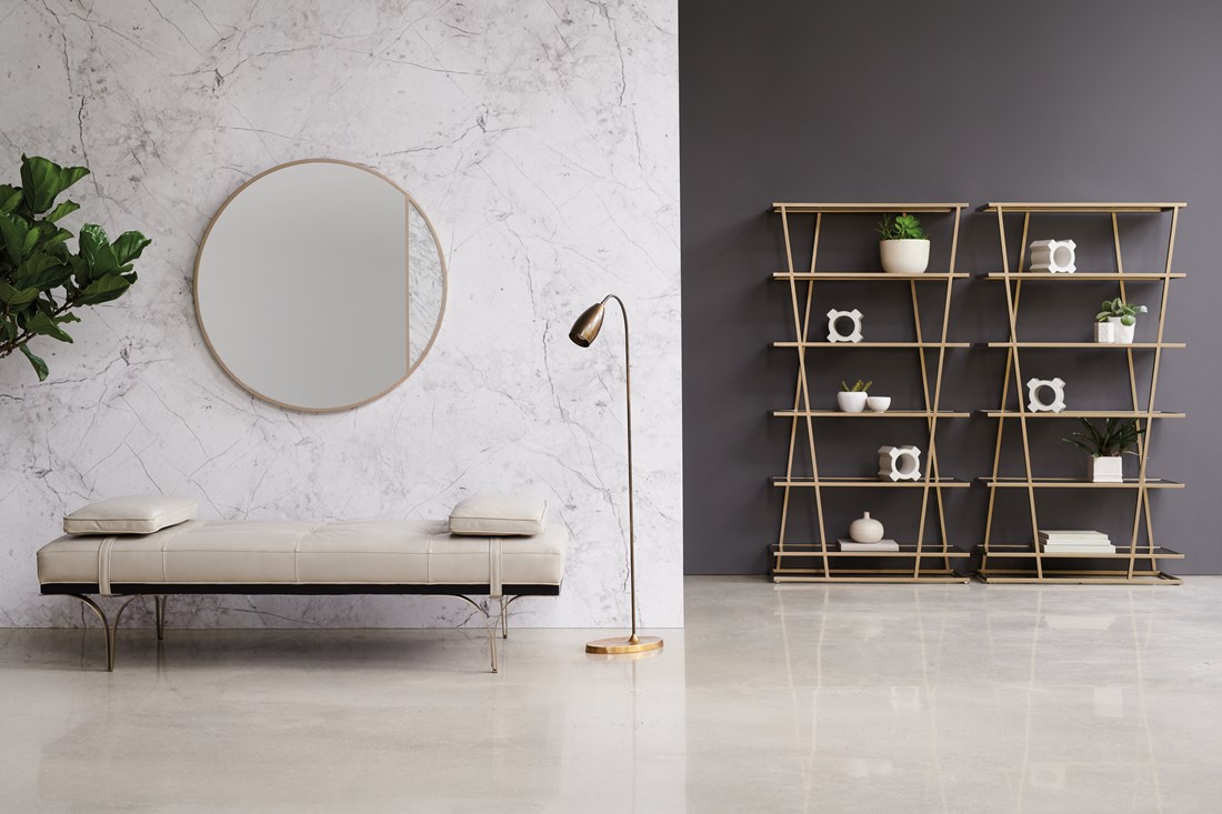 There's no other way to describe the eye-stopping beauty of this elegant etagere. Open, airy, and sophisticate - its presence will upgrade the style of any room while adding an essential tall vertical element. A plated-metal frame finished in Lucent Bronze gives it a touch of glamour while six glass shelves tinted in a warm brown provide a place for storage and display. Display one or bunch a few together to create a modern focal point and enjoy the effect of its unmistakable charisma.