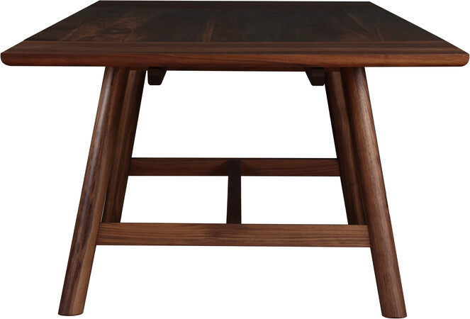 This dynamic mid-century-inspired table thoughtfully showcases the natural beauty of walnut grain. Its base is anchored by angled round leg posts that create a contoured silhouette and features discreet pull-out extensions to support two 18-inch leaves. The 74-inch table extends to 110 inches for larger gatherings.