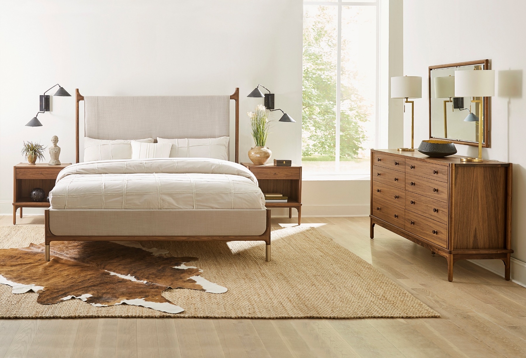 The eight-drawer Walnut Grove Dresser in mid-century modern style displays the inherent beauty of walnut grain. Exposed pin joints speak to its honest, lasting construction, and custom turned walnut knobs with soft brass accents add a unique touch to a piece that is as functional as it is attractive.