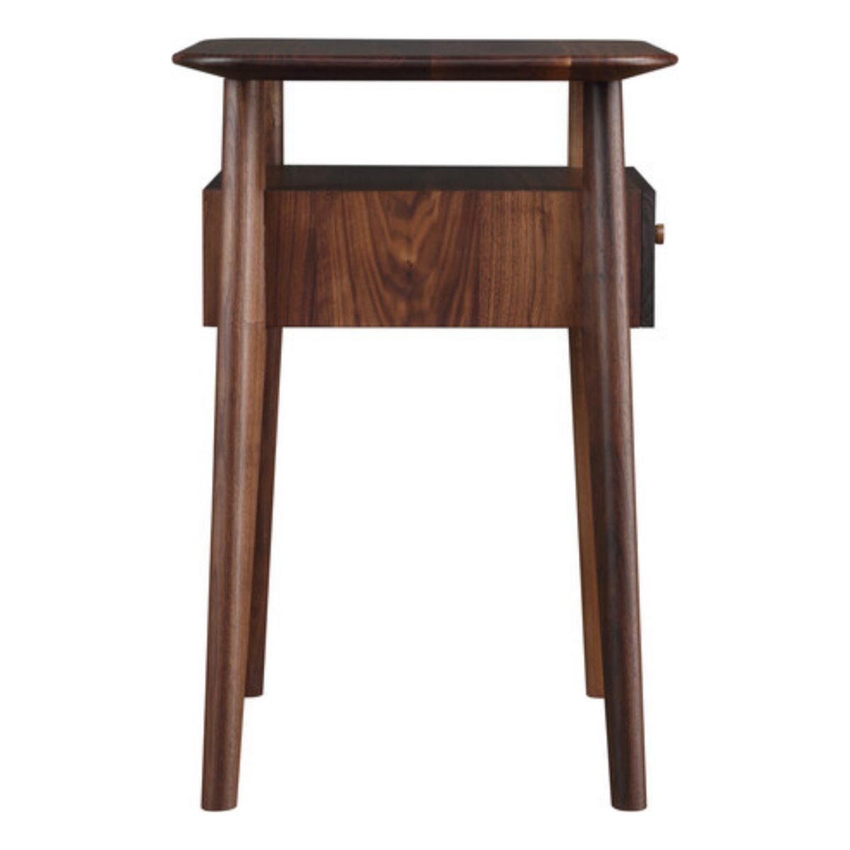 The Walnut Grove Nightstand combines mid-century modern style with practical storage, featuring a floating drawer and open shelving. Rounded posts highlight the natural beauty of walnut wood.