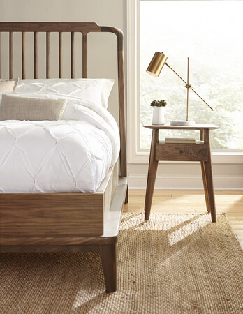 The mid-century modern Walnut Grove Nightstand offers ample storage with its floating box drawer and open shelving. Flowing round posts beautifully showcase the charm of rich walnut.