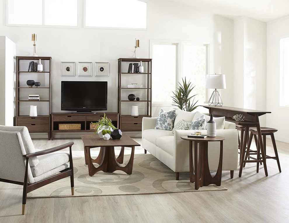 The dynamic base supporting our Rectangular Cocktail Table's broad solid-walnut top is formed by a series of slightly offset ellipses inspired by mid-century modern design. The result is unexpected lightness and airiness, and a beauty that changes with every angle.